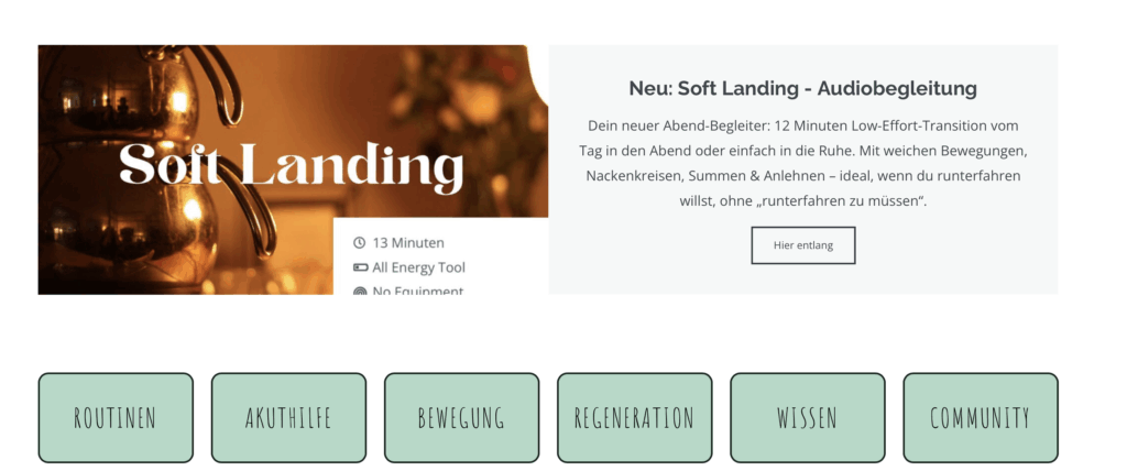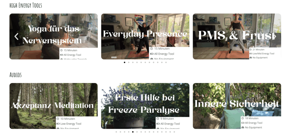 Genau dafür habe ich diese Membership geschaffen: eine wachsende Video- und Audio-Galerie mit somatischen Übungen, traumasensibler Nervensystem-Regulation und alltagstauglichen Tools, die dein System auf sanfte Weise unterstützen – ohne Druck, ohne Perfektionismus, ohne Geschwurbel und mit viel Sanftheit und Humor.