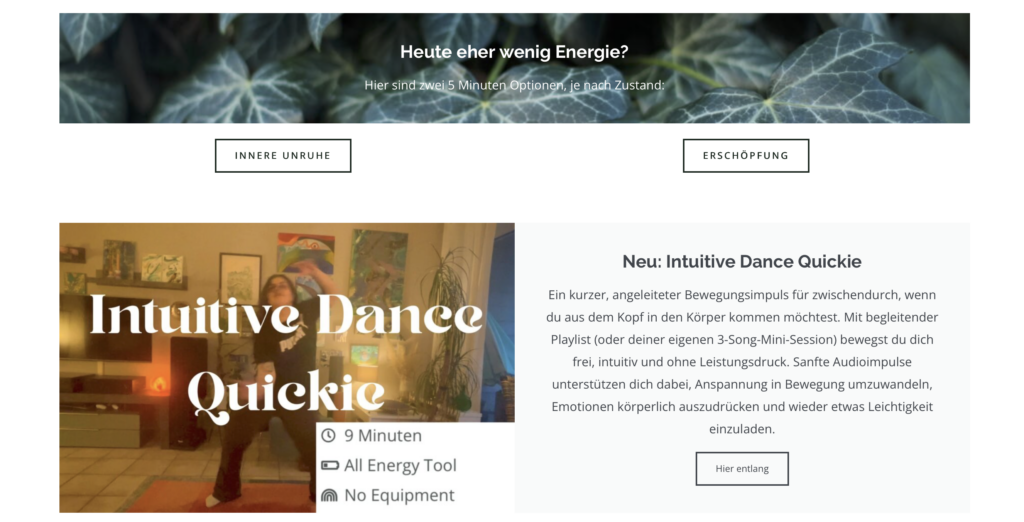 Genau dafür ist die Membership da: eine wachsende Sammlung aus kurzen Body-Tools, Audio-Impulsen und alltagsnahen Sessions, die dich dabei unterstützen, dich verbundener, ruhiger und stabiler zu fühlen. Ein praktischer Raum, in dem du ausprobieren kannst, was deinem Körper gut tut. Sanft, verständlich und absolut umsetzbar.