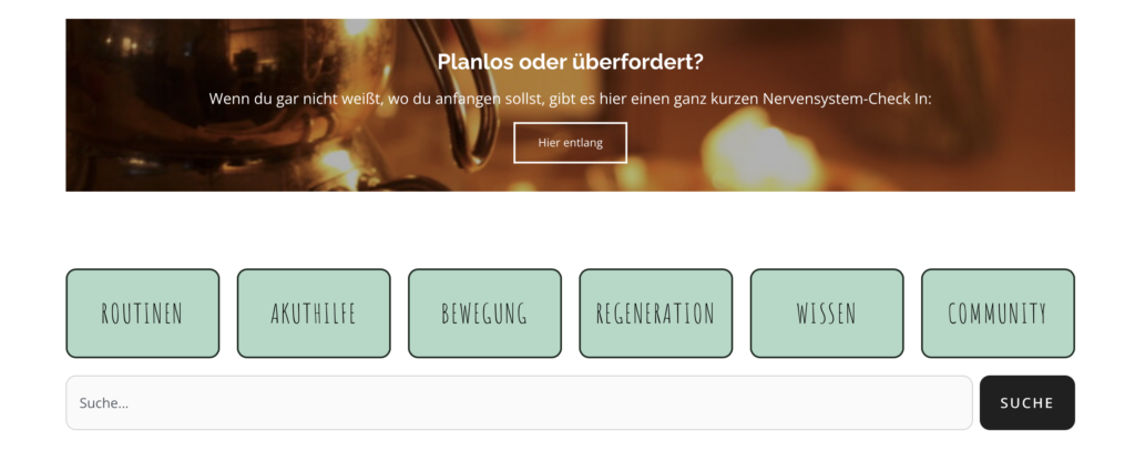 Die Inhalte dieser Membership dienen der sanften Unterstützung des Nervensystems und können dabei helfen, mehr Ruhe, Regulation und Ausruhen im Alltag zu finden. Sie stellen keine medizinische, psychotherapeutische oder psychiatrische Behandlung dar und ersetzen weder eine Diagnose noch eine professionelle therapeutische oder ärztliche Begleitung.